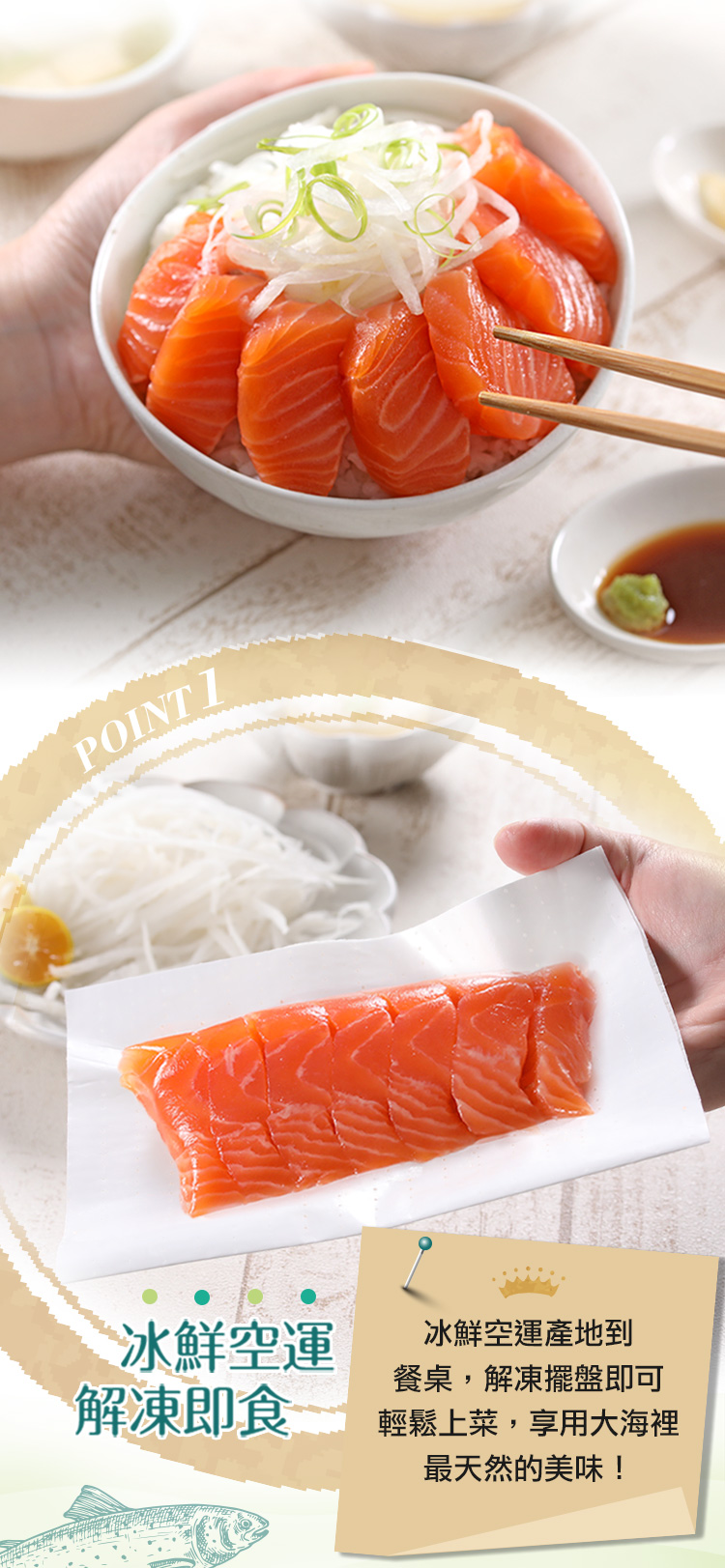 嚴選澳洲冰鮮鮭魚,冰鮮空運產地到餐桌,清肉切塊無需動刀切,解凍擺盤後即可輕鬆上菜,天冷不想出門時,一人也能開心享吃優鮮鮭魚生魚片啦!