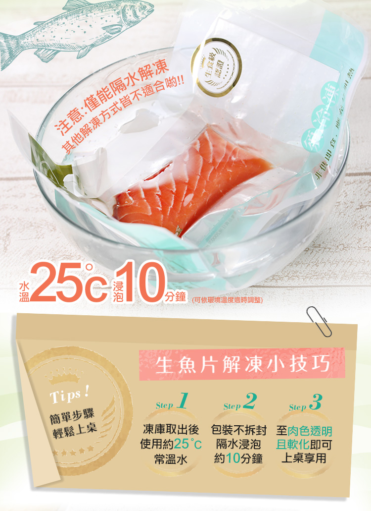 解凍方式:需以25~27度c左右水溫,無需拆封隔水浸泡浸泡約10分鐘,至肉色透明且軟化即可,(注意:只能隔水解凍,其他解凍方式皆不適用。)