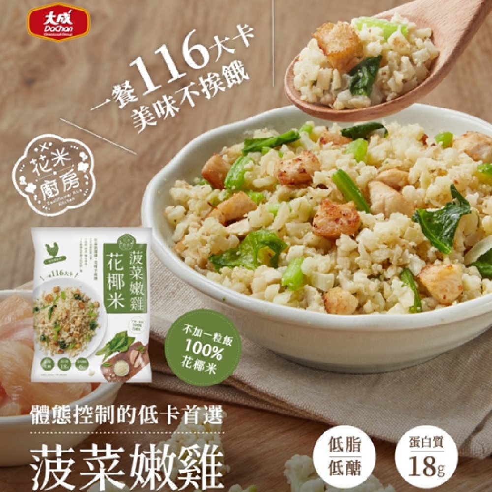 1.商品組合/規格:大成︱花米廚房︱菠菜嫩雞花椰米 2包組 (250g/包) 【大成食品】 減醣/生酮/低GI