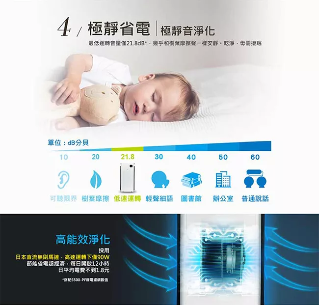 █ 極靜音低速運轉僅21.8dB,淨化不擾眠