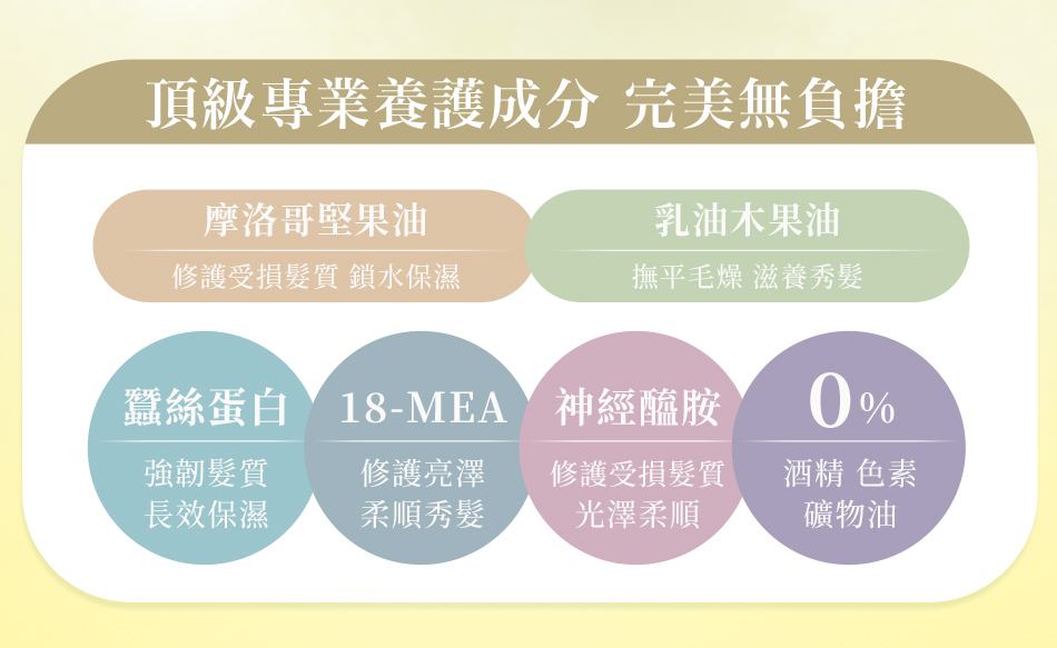 富含蠶絲蛋白、神經醯胺等,給予髮絲養分