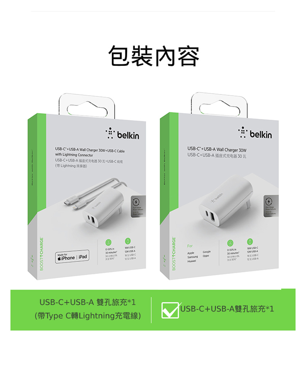 ●30W雙孔充電(Type-C 18W + USB-A 12W)