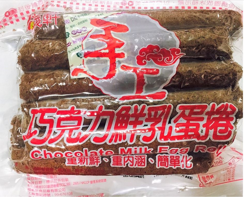 巧克力蛋捲:雞蛋、奶油、麵粉、砂糖、巧克力、鮮乳、奶粉、可可粉、 鹽、維生素 E(抗氧化劑)