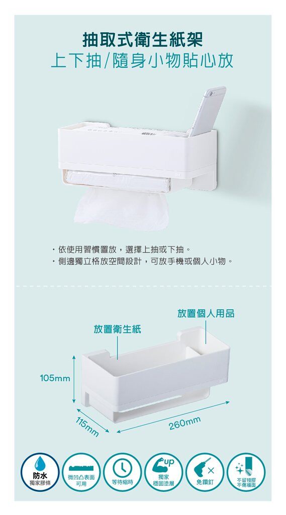 1. 抽取式衛生紙架可承重3公斤,使用4片無痕大型防水膠條