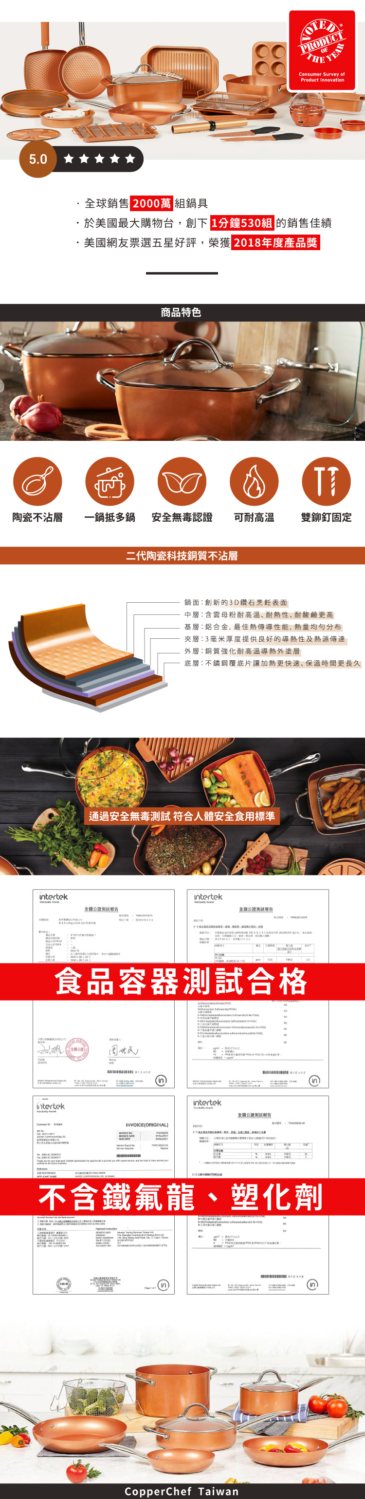 ■ 將中華料理的概念融入Copper Chef 的設計中,開發出圓型深炒鍋,並開始了鍋具類以外的廚具系列產品,油炸籃、刀具、烘焙、烤盤…等,更貼近國人的使用習性,七種料理方式煎、煮、炒、炸、蒸、烘、燉一鍋搞定,再將品牌推上高峰。於美國2018年獲得廚具類最佳產品獎