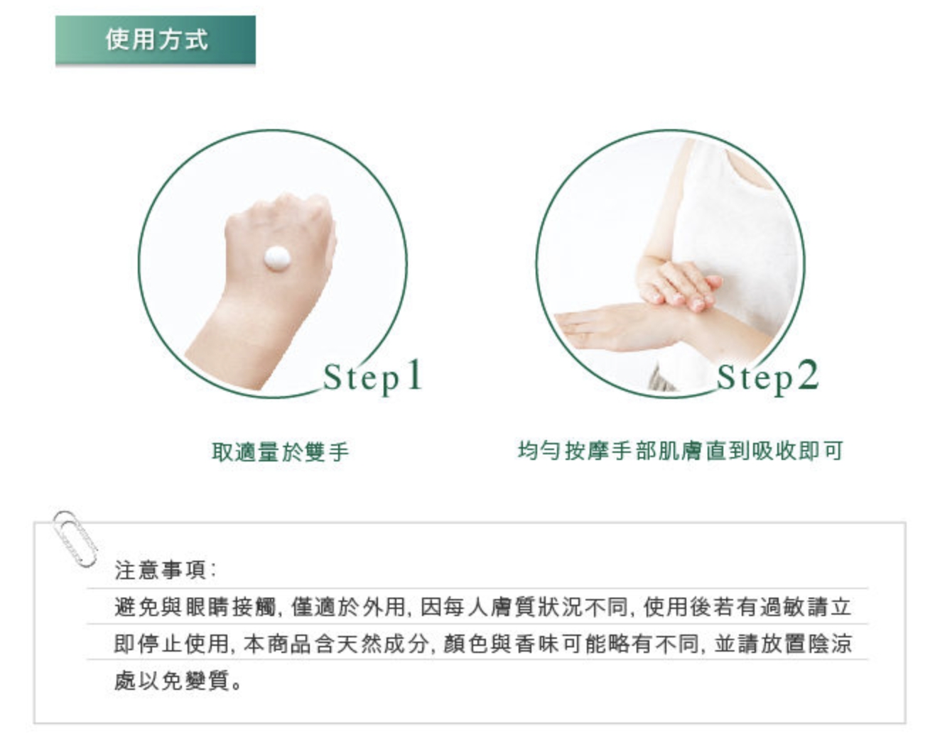 -使用方式:STEP1:取適量於雙手 STEP 2:均勻按摩手部肌膚直到吸收即可
