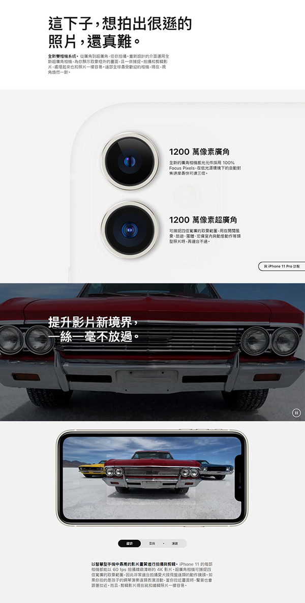 ◎4K影片拍攝,24 fps、30 fps或60 fps;1080p HD影片拍攝,30 fps或60 fps;720p HD影片拍攝,30 fps;延伸動態範圍影片拍攝,最高可達60 fps;適用於影片拍攝的光學影像穩定功能(廣角);2倍光學變焦縮小;最高可達3倍數位變焦、音訊變焦、更亮的原彩閃光燈、具備主體追蹤的影片快錄功能、支援1080p(120 fps 或240 fps) 的慢動作影片、具備視訊穩定功能的縮時攝影、電影級視訊穩定功能 (4K、1080p與720p)、連續自動對焦錄影、錄製4K影片時可拍攝 800萬像素靜照、縮放播放、影片拍攝格式:HEVC與H.264;立體聲錄音