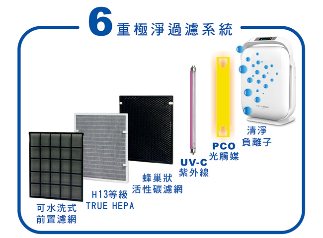 *可水洗式前置濾網、H13等級TRUE HEPA濾網及蜂巢狀活性碳濾網